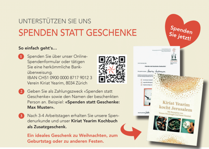 Schenken Sie doppelt Freude mit unserem "Kiriat Yearim kocht Jerusalem" Kochbuch von den beiden international bekannten Starköchen Yotam Ottolenghi und Sami Tamimi.