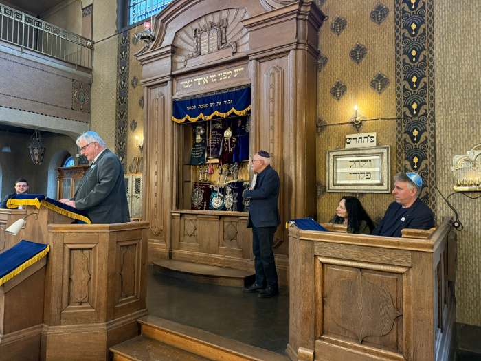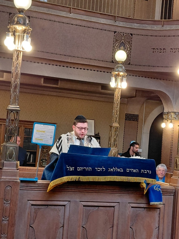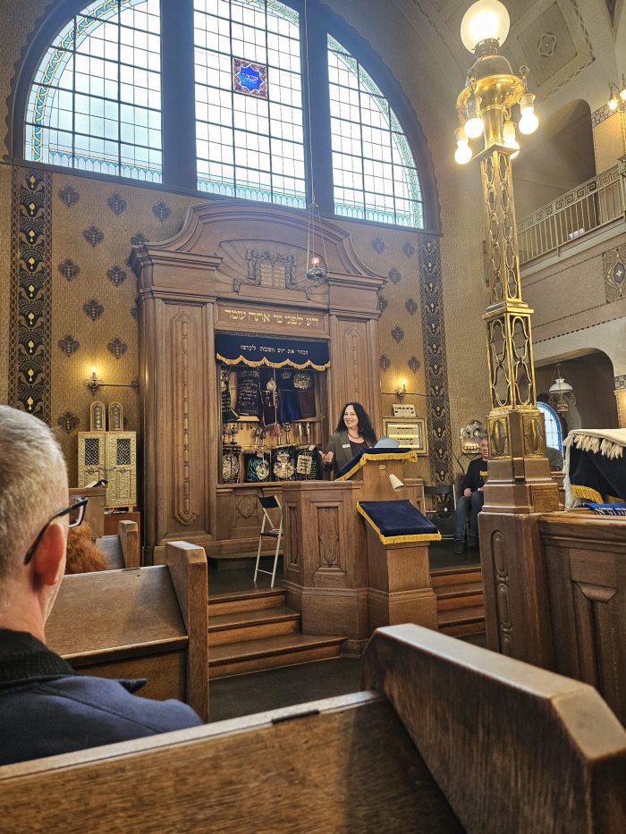 Leider musste der angekündigte Rabbiner Dr. Jehoshua Ahrens aus gesundheitlichen Gründen kurzfristig absagen. Ganz spontan hat sich das Vorstandsmitglied der Israelitischen Kultusgemeinde, Herr Raphael Weisz, bereit erklärt, in die Bresche zu springen. In der einzigartigen Jugendstilsynagoge erzählte er viel Wissenswertes über jüdisches Leben mit seinen Ritualen und Traditionen. Der Hausherr Rabbiner Avraham Muller sang mit seiner wunderschönen Stimme ein Gebet vor, das viele Gäste sichtlich berührte.